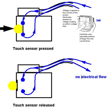 Semua jenis sensor ini memiliki cara kerja yang sama, yaitu menangkap perubahan arus dan sinyal-sinyal listrik yang ada pada sensor tersebut, merekamnya dan mengubahnya menjadi titik-titik koordinat yang berada di atas layar, sehingga posisi tepat dari sebuah sentuhan dapat langsung diketahui dengan benar.
